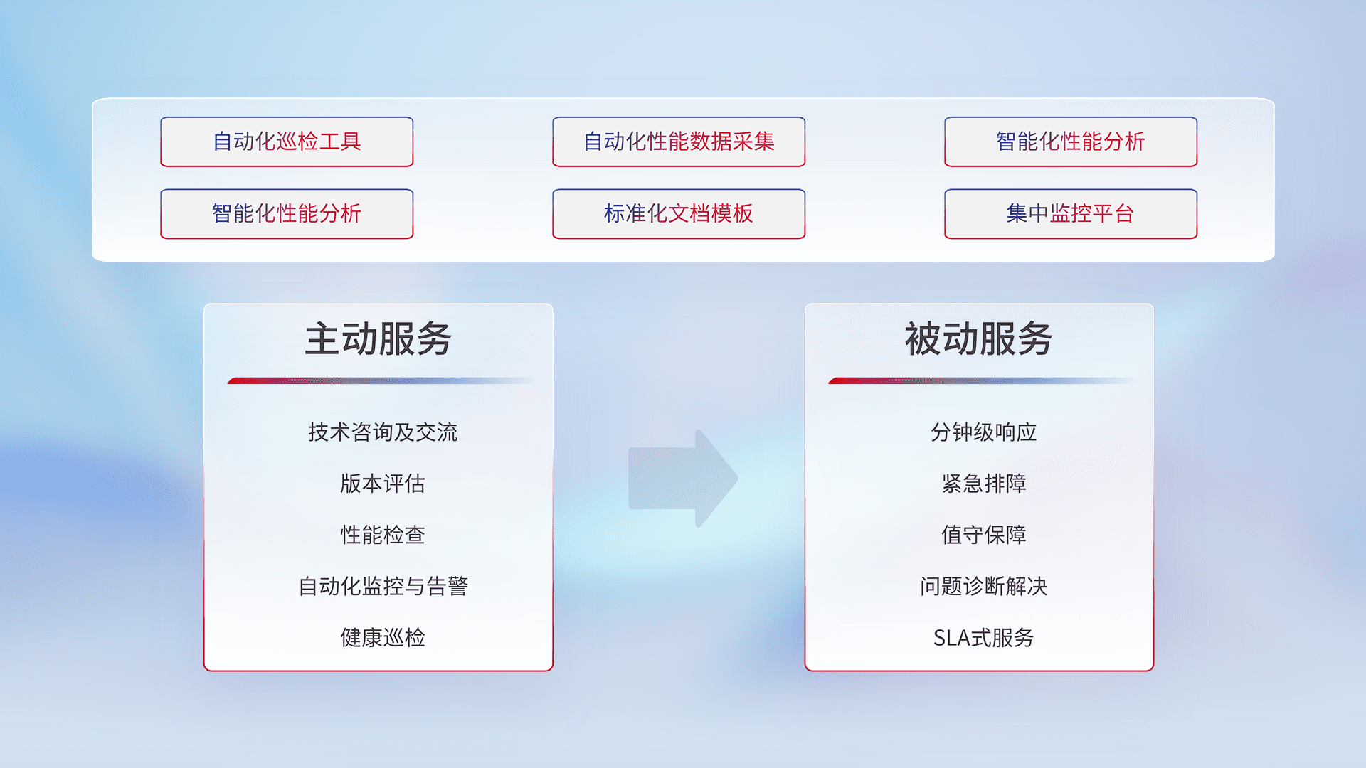 智能化工具和标准化文档,,,保障服务质量,,,提供主动服务(包含技术咨询、、、、版本评估、、性能检查、、、、自动化监控与告警、、健康巡检)和被动服务包含(分钟级响应、、紧急排障、、值守保障、、、、问题诊断解决、、SLA服务)。。。。